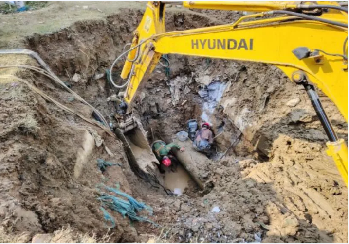 搶修過程中,團隊遭遇了嚴峻挑戰(zhàn)——漏點管道被混凝土結構整體包裹,且受前期降雨影響,地基沉降導致管道承壓斷裂。面對復雜工況,現(xiàn)場指揮組果斷調(diào)整方案,采取“破拆+定制”同步推進的創(chuàng)新策略:一組人員連夜開展混凝土破拆,另一組技術骨干同步定制專用修復管件,克服了夜間施工、作業(yè)面狹窄等多重困難。